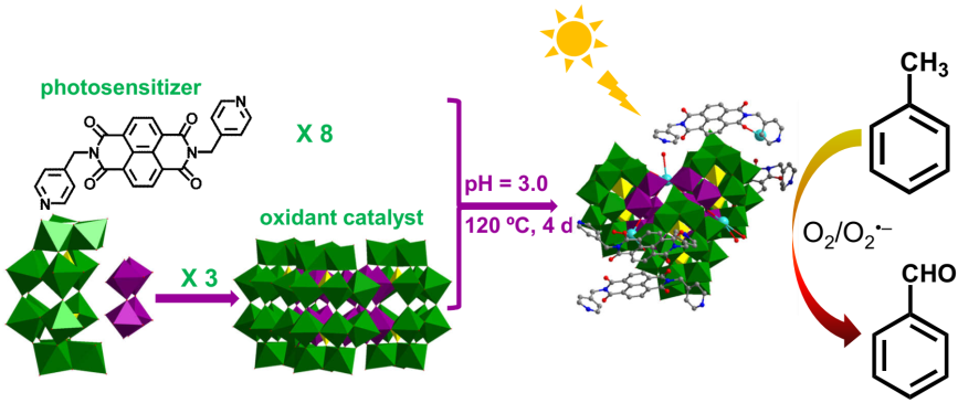Selective oxidation of primary carbon-hydrogen bonds under mild condition is a major challenge in academic and industrial aspects. In this work, a rare hybrid K6(H2O)8H24(C26H16N4O4)8[P6W48Fe6O180]·6H2O (FeW–DPNDI) was prepared from K12[α-H2P2W12O48]·24H2O, DPNDI and FeSO4·7H2O by solvothermal method (Figure 1). In FeW–DPNDI, [P6W48Fe6O180]30– and DPNDI are orderly arranged in the three-dimensional framework by the anion···π interaction and C–H···O hydrogen bonds, that is beneficial to promote the electron transfer among components. This is not only the first example of the trimmer of Fe-substituted Dawson derivatives but also an unprecedented report on activating C-H bond of toluene by hybrid POM under white light irradiation. In contrast to the previous photocatalysts for toluene oxidation to benzaldehyde, FeW–DPNDI shows a higher selectivity. Moreover, FeW–DPNDI can be easily isolated from the products and reused at least five times with no significant change in conversion and selectivity. The mechanism of the photocatalystic reaction was also explored. This work might show one method for synthesis metal-oxo clusters for photocatalytic hydrocarbon conversion.