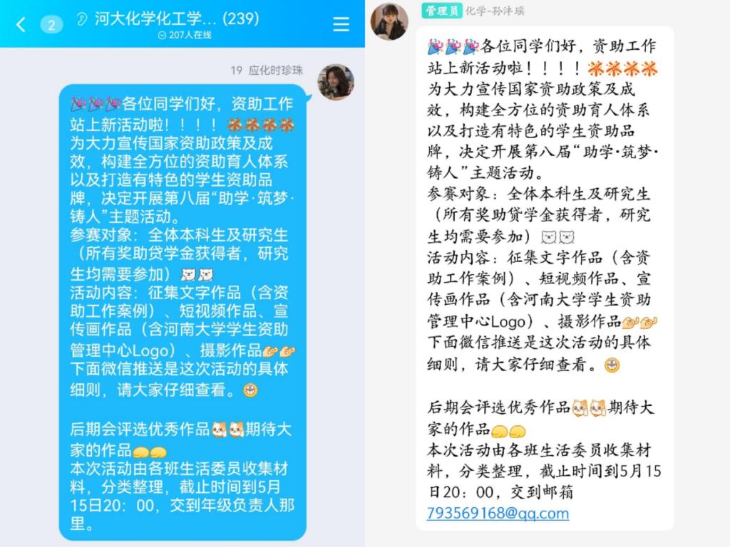 资助站站长田梦老师在工作群动员各年级辅导员广泛宣传,并在资助工作会议中强调此次活动的重要性,在各年级详细讲解活动的参与方式、作品要求、评奖办法、奖项设置等要求。为调动同学们参加活动的积极性,各年级资助负责人在活动期间也多次宣传活动、更新要求。