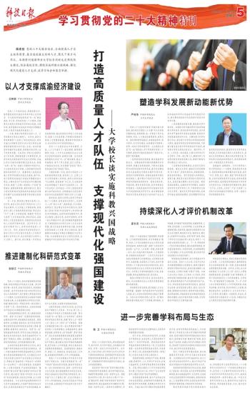 党的二十大为实现高水平科技自立自强指明了前进方向。河南大学将抢抓“双一流”“双航母”叠加的历史机遇,锚定研究型综合性一流大学的战略目标,发挥一流学科及综合交叉优势,强力推进建制化科研范式变革,形成从基础到应用的贯通式研发体系,深入实施“123人才强校工程”,打造中原地区人才中心和创新高地,为加快实现高水平科技自立自强,全面推进中华民族伟大复兴而不懈奋斗。