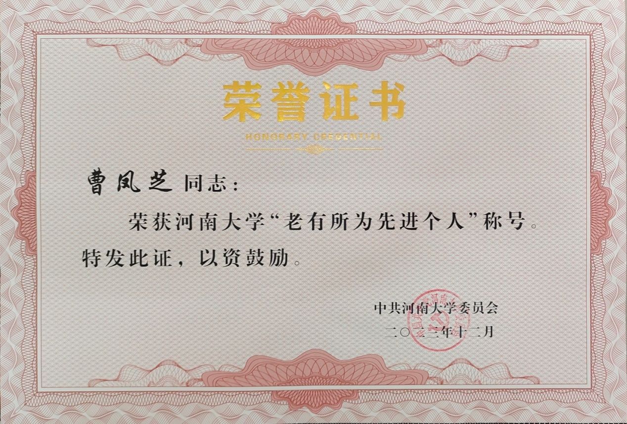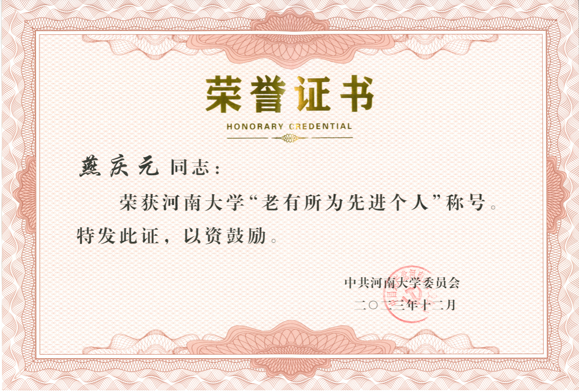 退休教师燕庆元、曹凤芝被授予河南大学“老有所为”先进个人荣誉称号。