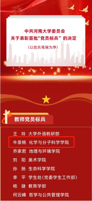牛景杨教授入选河南大学首批“党员教师标兵”。
