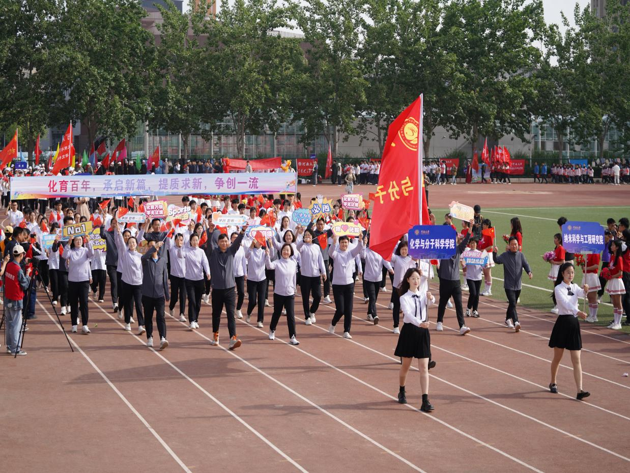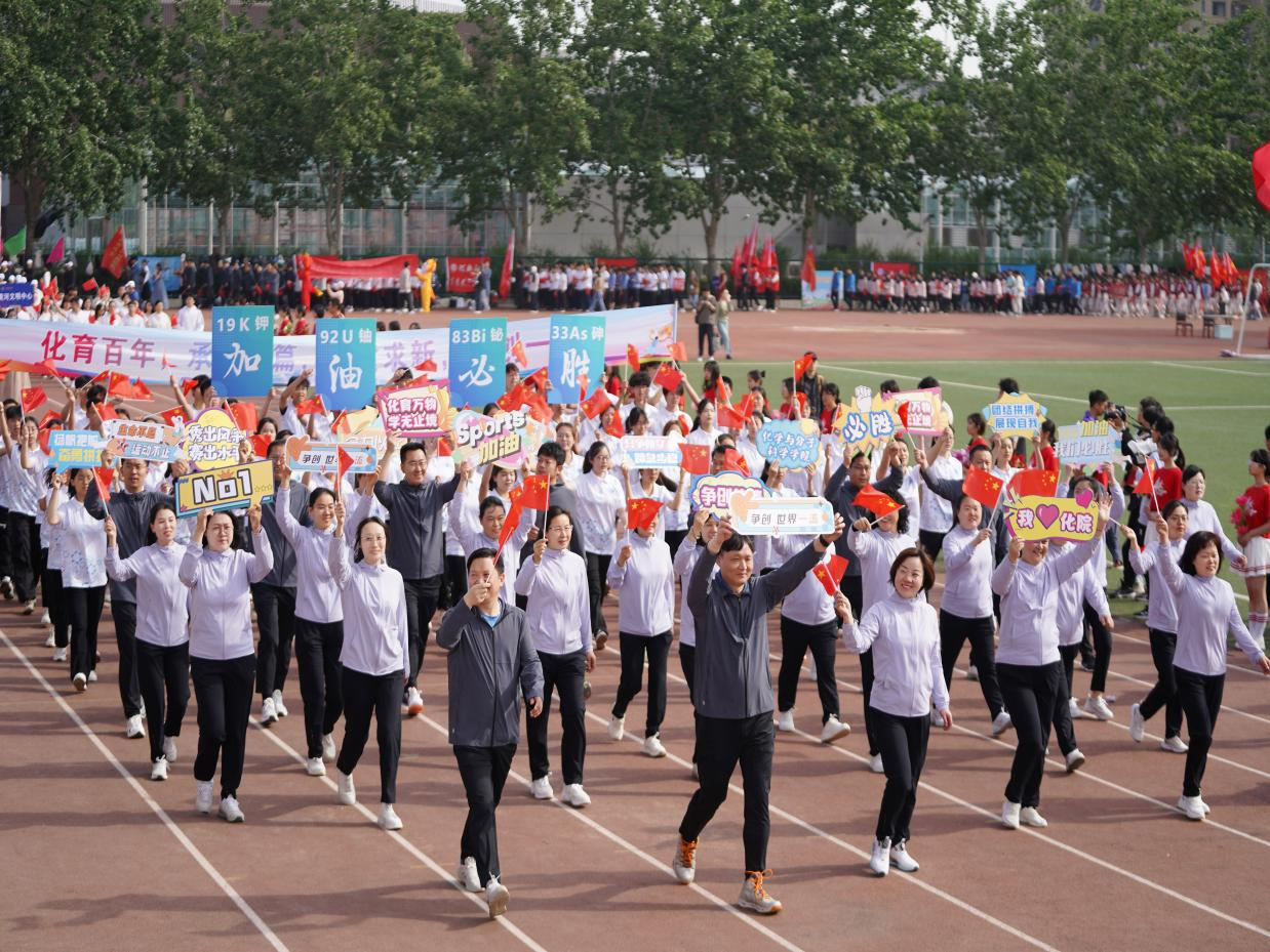 方阵以党委书记常凤香为领队,教职工们身着统一的服装,手中挥舞着红色国旗,举着“化育万物,学无止境”“争创世界一流”“Sports 加油”“秀出风格,赛出水平”等各类标语,精神抖擞。同学们身穿印有化学结构式的白色短袖,组成的方阵秩序井然,他们迈着整齐划一的步伐,举着醒目的旗帜——“化育百年,承启新篇,提质求新,争创一流”,体现了体球网即时比分足球比分