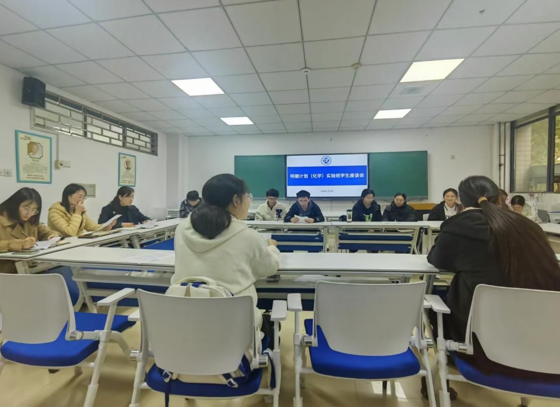 于106教室成功举办明德计划(化学)实验班学生座谈会。会议由化学系主任李亚敏主持,同时参会的还有冯彩霞、田梦、范玉超老师,以及明德计划实验班部分同学。