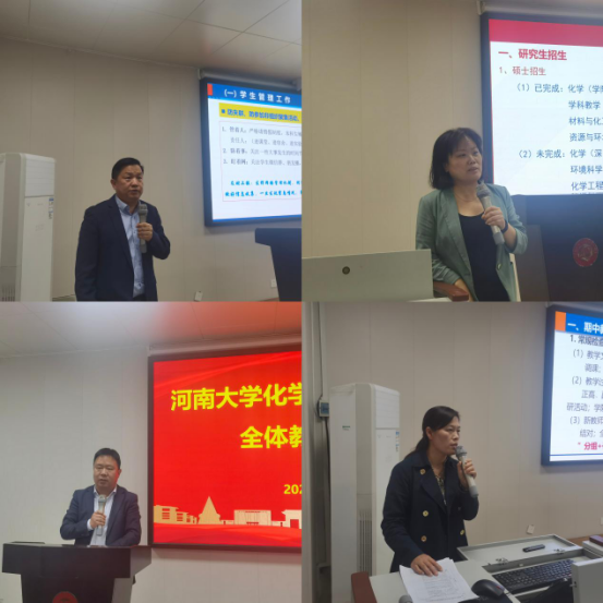 近期党建、工会及学生相关工作情况,并对师德师风提出具体要求,副院长屈建莹总结了研究生教育管理相关工作情况,副院长吴玉锋通报近期实验室安全工作要求及发现的问题,要求限期整改,同时强调各平台、实验室要规范使用经费,教学负责人李亚敏通报教学期中检查相关工作情况。