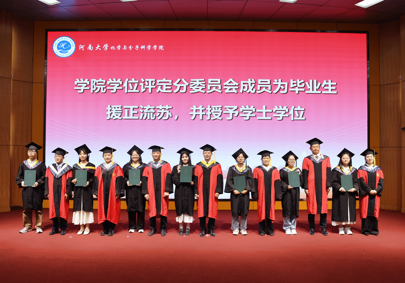 学位评定分委员会老师们为毕业生援正流苏,颁发学位证书并合影留念。