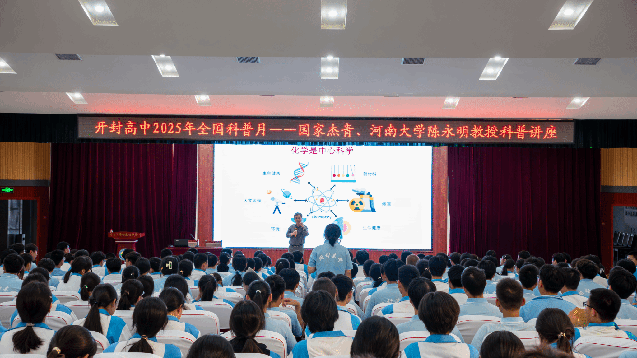 院长陈永明、化学系负责人冯彩霞、教务办公室主任王玉霞和院团委副书记田梦一行赴开封高级中学开展科普讲座和学生培养交流座谈活动。开封高级中学副校长尚嘉伟、化学组教研组长赵辉和教研组老师以及400余名学生参与了活动,开封高中教务处副主任刘冉主持座谈会及讲座。