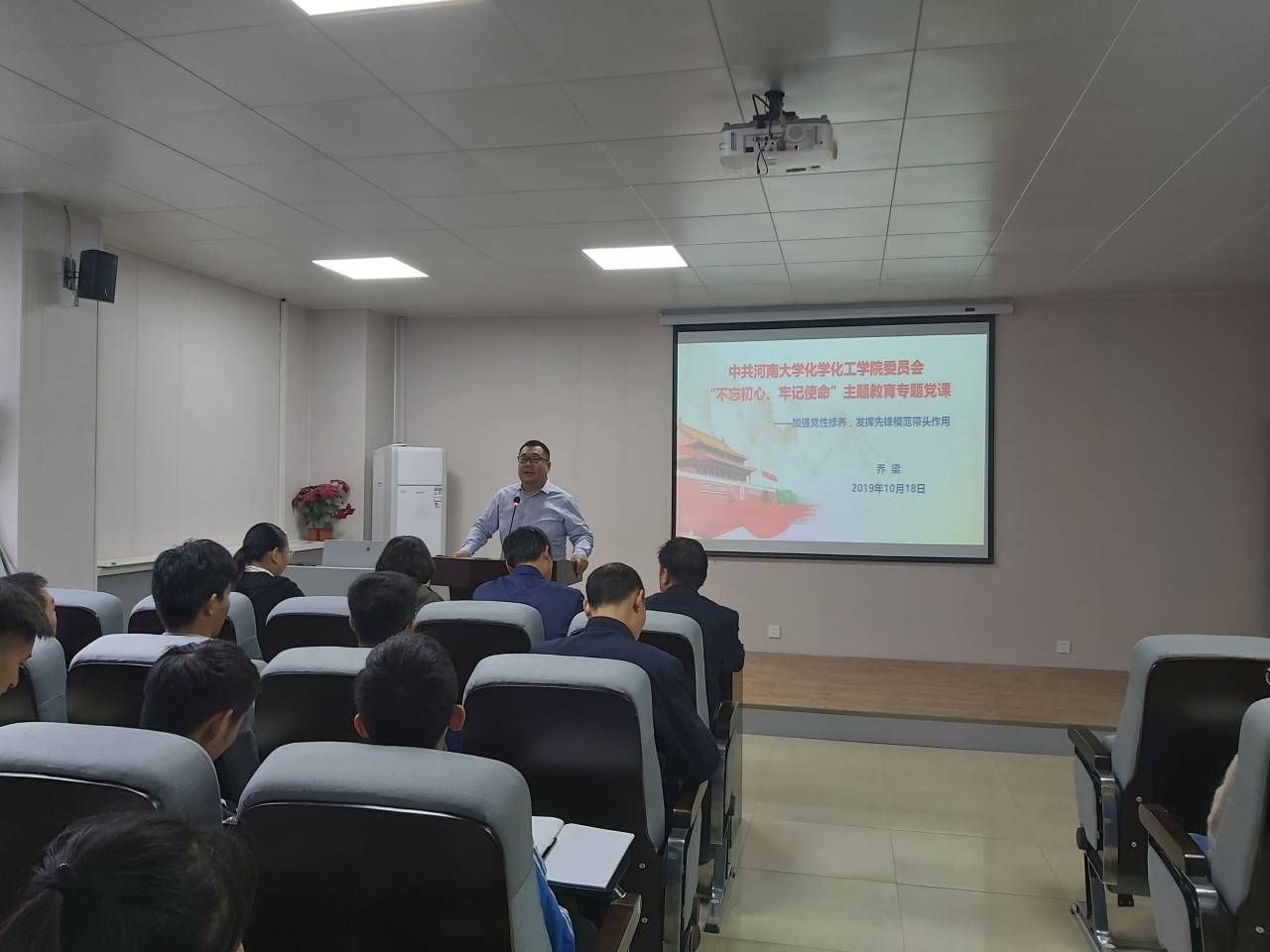 的学科优势及良好的发展前景,然后以“不忘初心、牢记使命”为主题从习近平总书记“不忘初心、牢记使命”重要论述、河南的“三个精神”以及大学生党员要加强党性修养、发挥先锋模范带头作用三个方面进行讲述。在讲述过程中,乔梁结合习近平总书记的一些重要论述以及自己的经历对话题进行深入的剖析,又结合我省的焦裕禄精神、红旗渠精神及愚公移山精神对青年党员发出号召,要求每一位学生党员要以史为鉴,把握现在,发扬开拓进取的精神。乔梁指出,大学生党员是大学生中的先进分子和骨干,是党的新鲜血液和未来社会主义建设的中坚力量。如何充分发挥大学生党员的先锋模范作用是新时期高校党建工作的重要课题,是和谐校园建设的重要环节,也是国家未来建设和发展的现实需要,更是加强学生党员自身建设的必然要求。他希望学生党员们要不断加强自己的党性修养,在各个方面都要发挥党员的先锋模范带头作用,为实现中华民族伟大复兴的中国梦而努力奋斗。