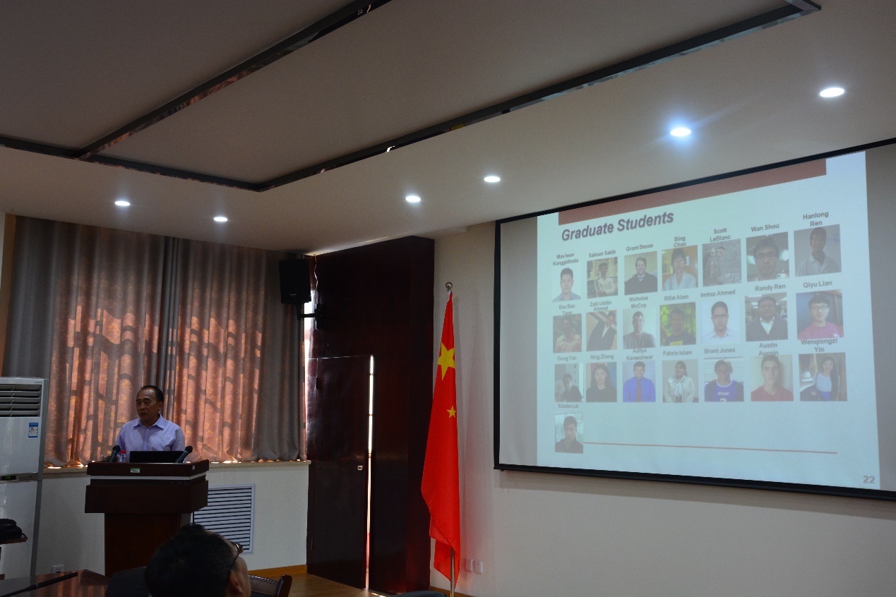 对他培养的感激之情,介绍了美国路易斯安娜大学的学校概况和教育体制,并与大家分享了自己学在路易斯安娜大学的工作经历。随后,他重点介绍了自主研发的有序介孔材料在污水处理有机污染物和重金属离子及在吸附方面的研究进展。最后,他讲述了在利用计算机模拟设计有序介孔材料的最新研究成果。报告后,与会师生和刚殿臣就碳材料研发、发展趋势以及留学等问题进行了热烈讨论。