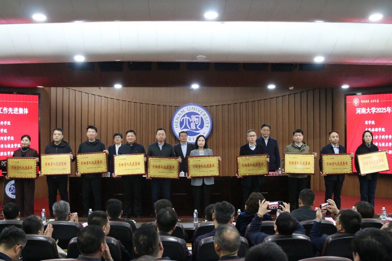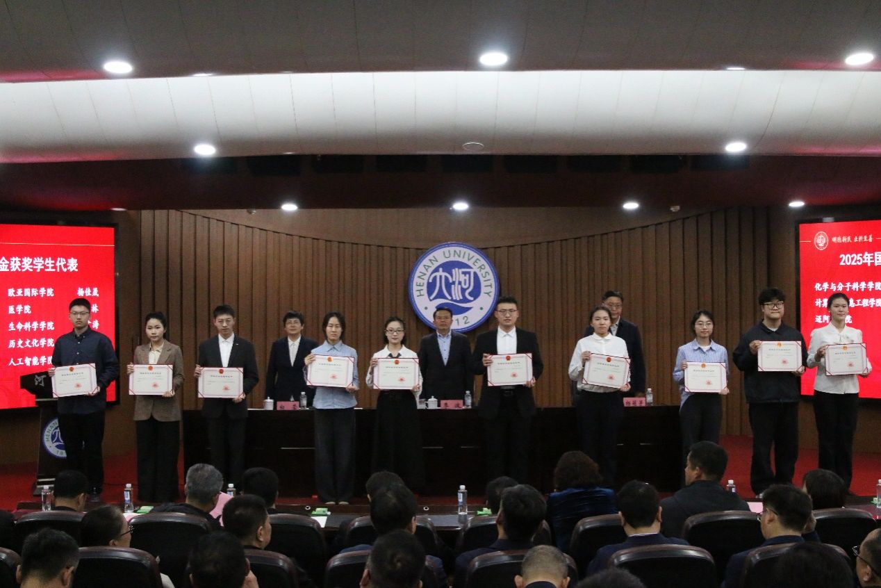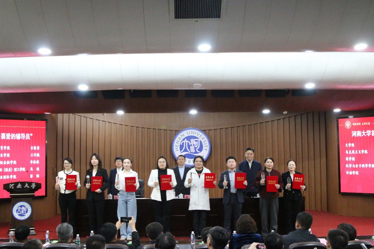 荣获资助育人先进集体荣誉,党办主任、2022级本科辅导员宁攀荣获河南大学首届“我最喜欢的辅导员”荣誉称号,2023级本科生金瑜作为国家奖学金获奖代表登台领奖。