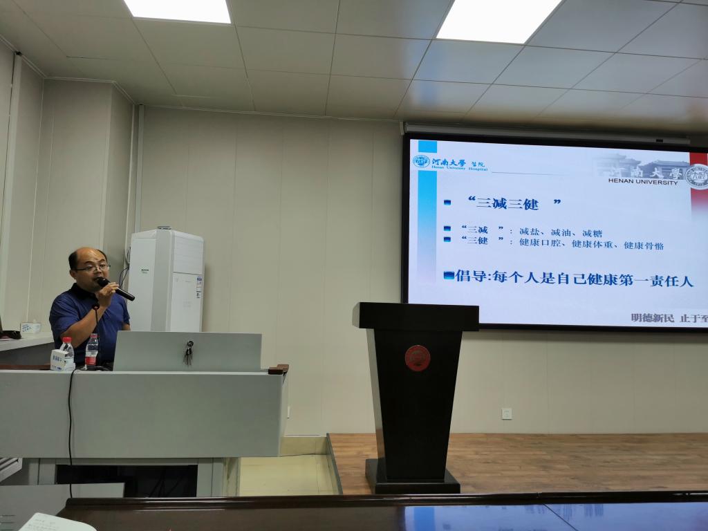 15日下午,校医院副院长张书申和新生开展健康教育。他从生理健康、心理健康、社会健康和道德健康展开讲述。他告诉新生,健康是一个动态过程,影响的因素很多,一定要正确对待。最后,他希望新生可以做到“三减三健,三减,减盐、减油、减糖;三健,指健康口腔、健康体重、健康骨骼最后,他倡导新生,每个人都是自已健康第一责任人,一定要做到对自己负责。