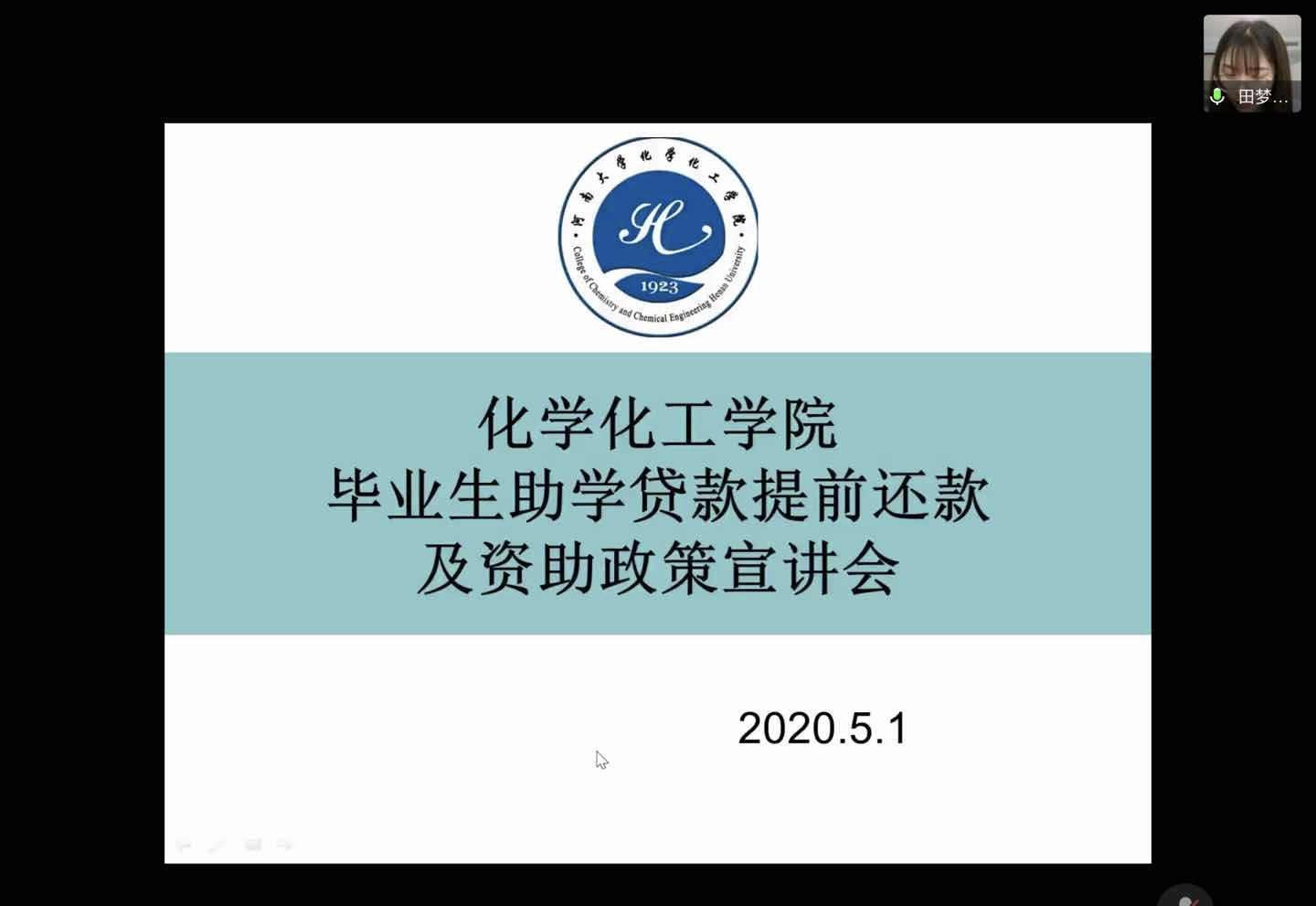 会议伊始,田梦向2020届毕业生讲解了提前还款的申请流程和还款方法,随后讲解了考取研究生的毕业生国家助学贷款划款计划变更、应征入伍学费补偿代偿、以及服务基层学费补偿代偿等资助政策。最后田梦强调了按时还款的重要性和拖欠还款的严重后果,履行约定、按时还贷是每个接受国家生源地信用助学贷款资助同学的义务,鼓励同学们诚实守信、提前还贷。随后,宁攀老师也做了相应的补充,并且强调了提前还款的重要性。