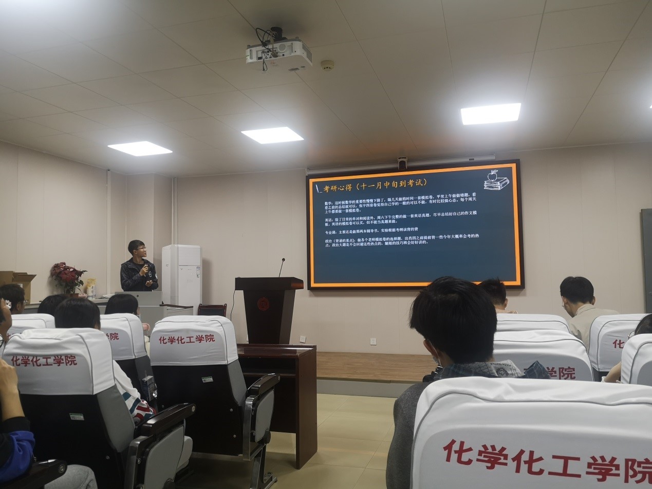 2017级刚刚考研成功上岸的7位学长学姐为大家分享考研经验。其中王俞清、张成琳、常博文、肖格和刘志豪五位同学结合自己的考研经历详细给大家介绍了自己备战考研的时间安排及应注意的问题,给大家推荐了自己认为不错的教辅资料和课程;王世航和朱媛媛两位同学则给大家分享了调剂过程中的一些心得体会。