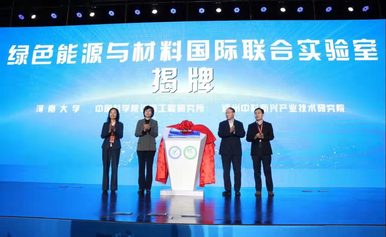 在热烈的掌声和共同的见证下,谭贞副校长登上主席台,与侯红市长、张锁江院士和郑州中科新兴产业技术研究院副院长张延强一起,为“绿色能源与材料国际联合实验室”揭牌。