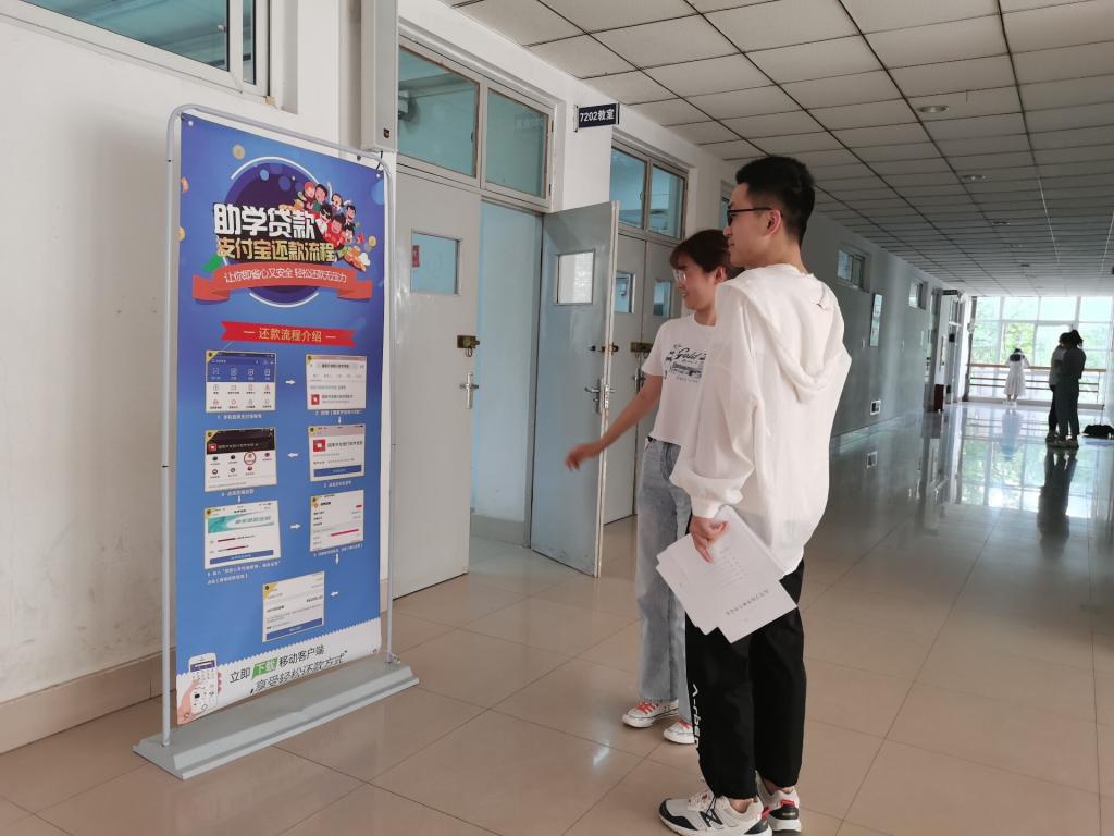 会后,发放了诚信还贷承诺书,由参会的贷款毕业生了解签字,提醒同学们诚信贷款,及时还款。同时在资助服务站成员的带领下,参会同学通过观看国家助学贷款支付宝还款流程和还款操作指南的展板,对还款流程进一步熟悉。