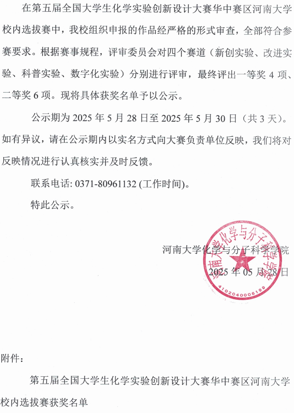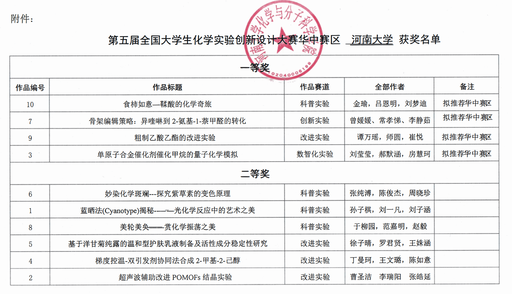 第五届全国大学生化学实验创新设计大赛华中赛区河南大学校内选拔赛获奖名单公示