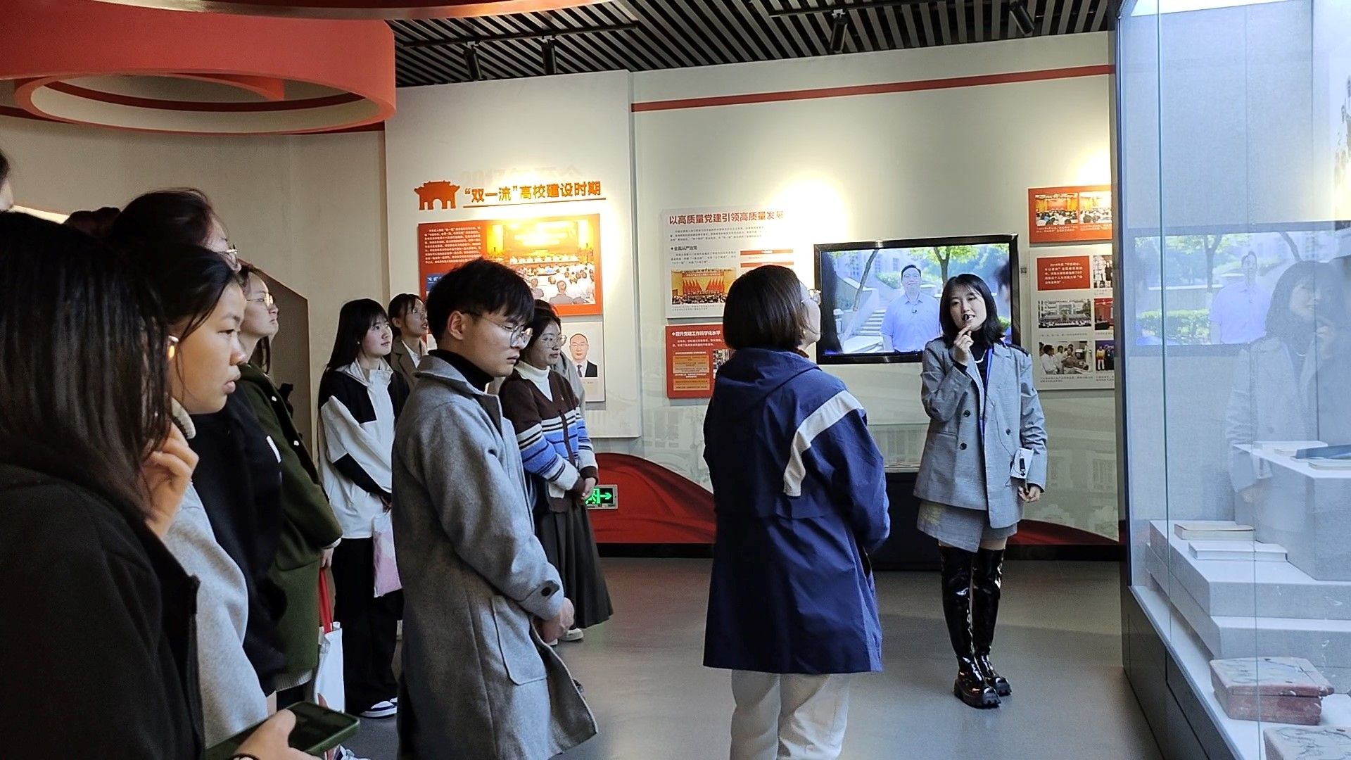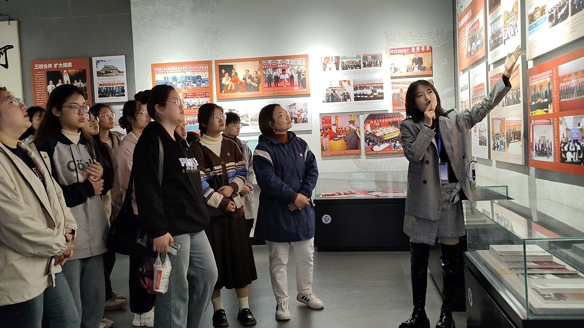 大家怀着崇敬的心情,有序地进入校史馆,这里展现了河南大学 110 年波澜壮阔的历史画卷。伴随着校史馆讲解员的精彩解说,同学们沿着“历史长廊”细致深入地了解河大的历史沿革和发展脉络,深切感受着一代又一代河大人励精图治、艰苦奋斗的创业史。