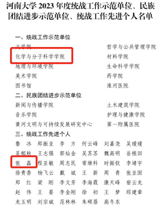 再度荣获河南大学统战工作示范单位,统战委员、副院长张磊荣获统战工作先进个人。