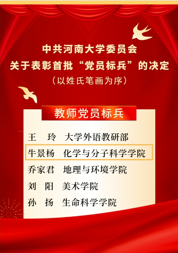 牛景杨始终以“四有”好老师的标准严格要求自己,坚持教书和育人相统一、言传和身教相统一。他主动将思政元素融入课堂,主讲了《高等无机化学》《多酸化学》《走近化学》等多门课程,其中《走近化学》被评为国家级视频公开课。他致力于将自身所学惠及更多学生,出版的《杂多化合物概论》《同多化合物概论》等著作,被东北师范大学、北京理工大学、河南大学等高校列为多酸化学研究方向研究生的必读书目。他的教学研究成果丰硕,自1999年开始指导硕士研究生、2007年开始指导博士研究生以来,牛老师连续培养硕士研究生75人,博士研究生10人,其中1人获得河南省优秀博士学位论文、4人获得河南大学优秀博士学位论文;12人获得河南省优秀硕士学位论文。