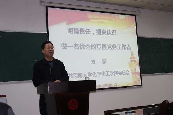 党委书记方蒙作了“明确职责,提高认识,做一名优秀的基层党务工作者”的首场培训报告。他分别就教职工党支部的主要职责、学生党支部的主要职责、党支部书记的工作职责和党支部的基本工作制度进行了详细的解读。他指出,作为一名党务工作者,特别是支部书记要知道自己应该做什么?对自己有什么要求?如果连自己是谁就不清楚,怎么去组织党员去学习,有效地开展工作?他要求每位党务工作者要认真对照职责和基本制度,反思工作,找到差距。