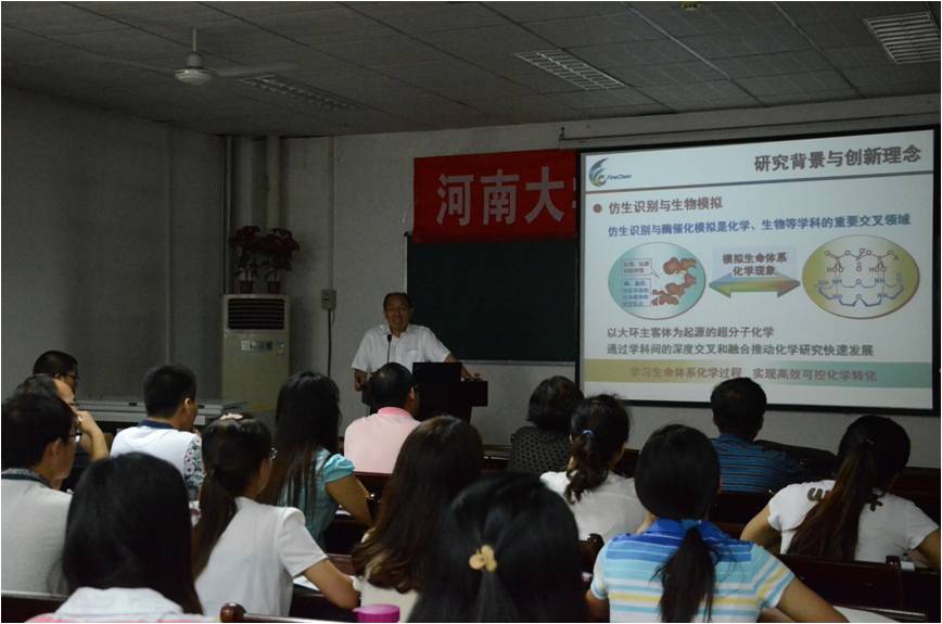 二楼会议室举行。报告中段教授主要讲解了仿生识别和仿生催化的相关内容,并在报告中提出自己的实验思路,以供现场研究生借鉴。结合自己课题组的研究成果,段教授图文并茂地展示了生物和化学的交叉点。他认为,化学实验设计可以从生物界得到思路。受到构建生物膜思想的启发,提出构建富电荷的亲水空腔(多酸)和疏水孔道(配体)。