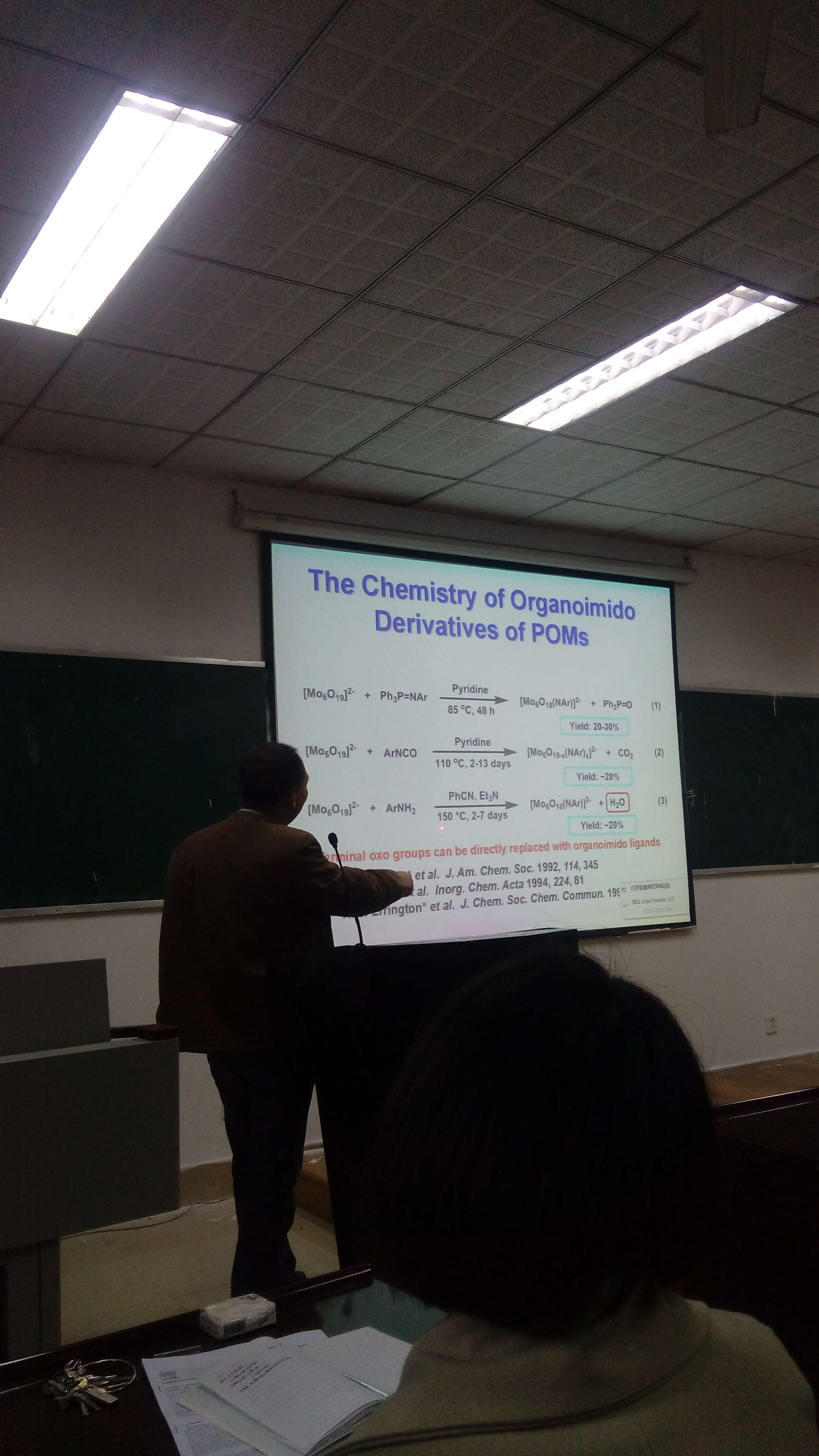报告中,魏永革教授首先介绍了多酸的结构类型及性能和应用。其次,主要介绍了多酸修饰的实验设计思路及其存在的问题和改进方案。报告结束,魏永革教授对提出的问题一一进行了耐心的解答,赢得了热烈的掌声。
