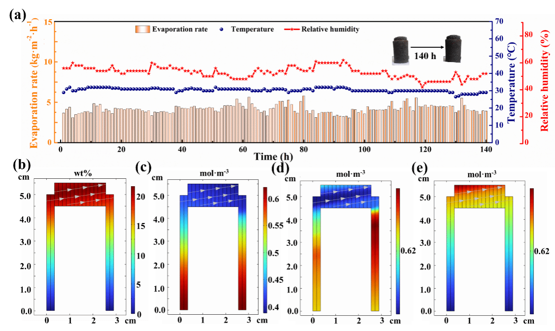 人口增长和气候变化导致淡水资源面临空前压力,利用太阳能作为唯一能源输入的太阳能驱动界面蒸发是一种前瞻性的海水淡化策略。海水蒸发过程中的表面盐结晶将极大影响太阳能吸收和水分输送,进而降低蒸发性能。构建水通路,保证盐度梯度驱动的回流和扩散,可有效改善盐结晶的影响,但过高的水传输效率又可能会增加热量损失,平衡水传输与热管理是三维界面蒸发研究中的关键问题之一。