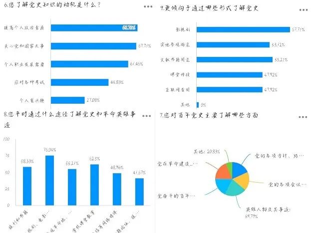 7月24日至27日,团队成员分别在线上和线下发布党史学习情况调研问卷。在收集了近百余份的调查问卷之后,团队对信息进行了整理。根据分析,受访人员中近七成的人通过且更倾向于从影视媒体中了解党史。总体来说,大多数人比较了解党史知识,并抱有积极学习的态度,但也有部分人认为学习党史只是为了考试。党史中蕴含着无限的宝藏,在进行党史宣传与学习时,我们应当保持多种途径宣传并行的方式,同时加强向人们感兴趣方向的宣传,将党史宣传活动进行地更远、更广、更深。