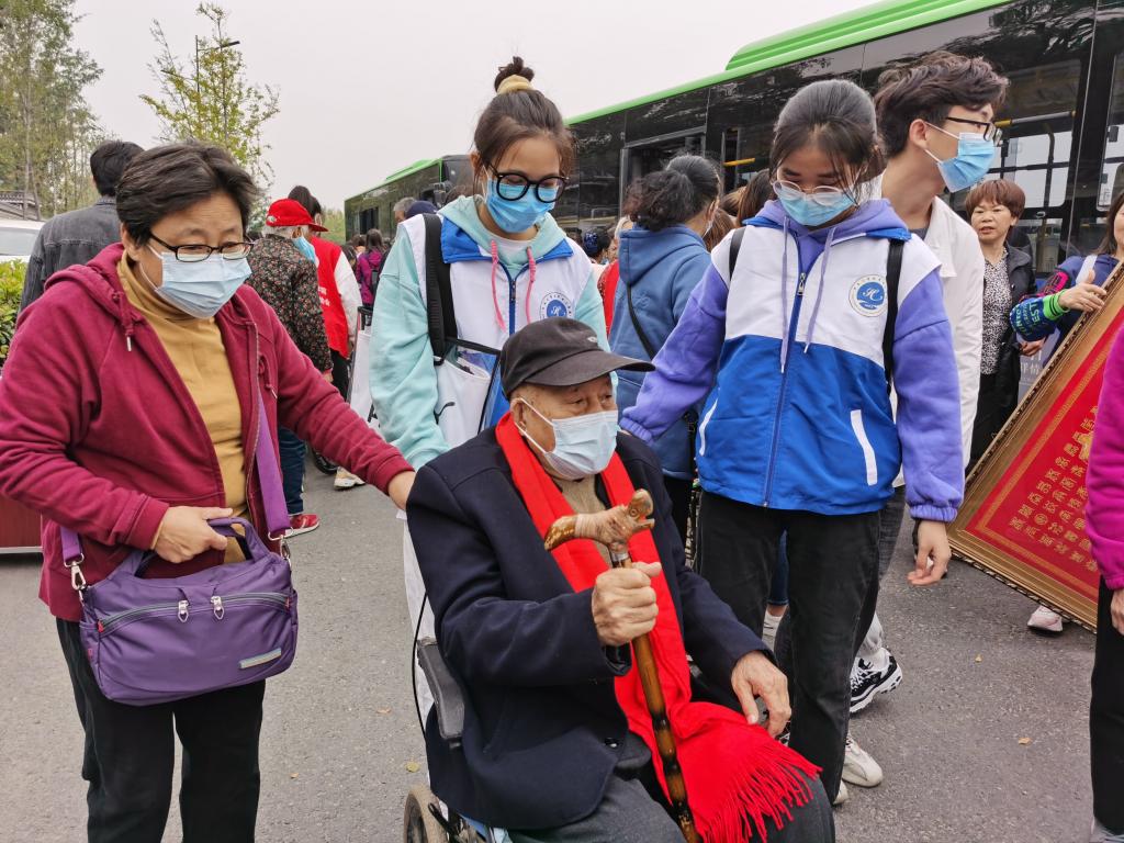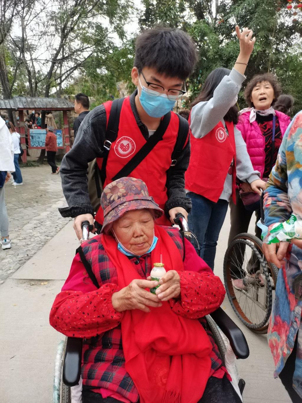 的志愿服装,静静等待老人们的到来。在与敬老院负责人的沟通后,志愿者们积极帮助老人下车,并推他们进入景区游玩,每个老人的身边都有着志愿者的身影。