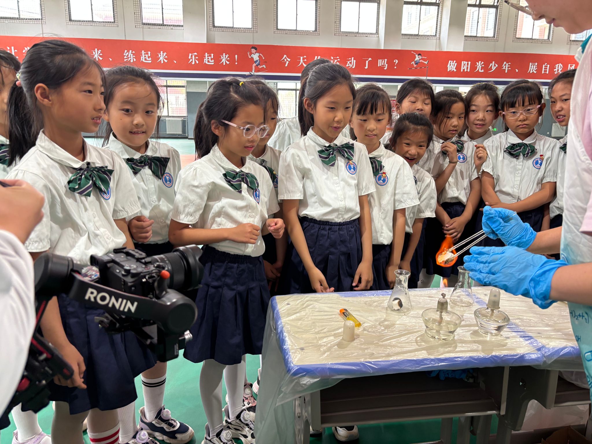 青年志愿者们准备了六个安全性、趣味性的化学实验展示,将复杂的原理转化为直观现象。在实验的同时,让小学生感受到化学的魅力。实验过程中,志愿者向孩子们讲解实验背后的化学知识,引导学生观察、提问以及在科学指引下让他们亲手体验化学实验的乐趣,激发青少年对化学的兴趣,培养其科学思维。活动现场,大象牙膏实验引发现场“哇”声一片,隐形书信呈现出青春的印记,膨胀的气球放飞对梦想的追求,彩虹牛奶点亮真理的色彩,糖火奇观燃烧求真的火光,彩虹瓶带来夏日飞雪啧啧称奇……活动结束后,志愿者们打扫场地,并进行了合影留念。