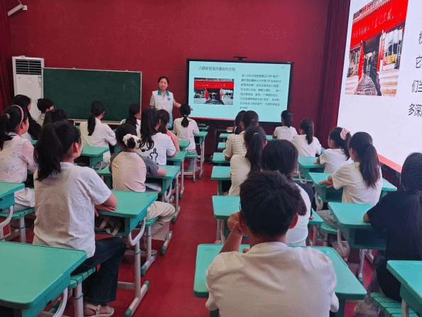 团队在安徽省宿州市埇桥区符离镇第三小学开展宣讲。他们生动讲述抗日战争英雄事迹,感染了在场小朋友;组织“传承红色基因”手抄报比赛,让孩子们用画笔表达爱国情;结合实践见闻,分享当地发展变迁,帮助孩子理解红色精神在新时代的传承。