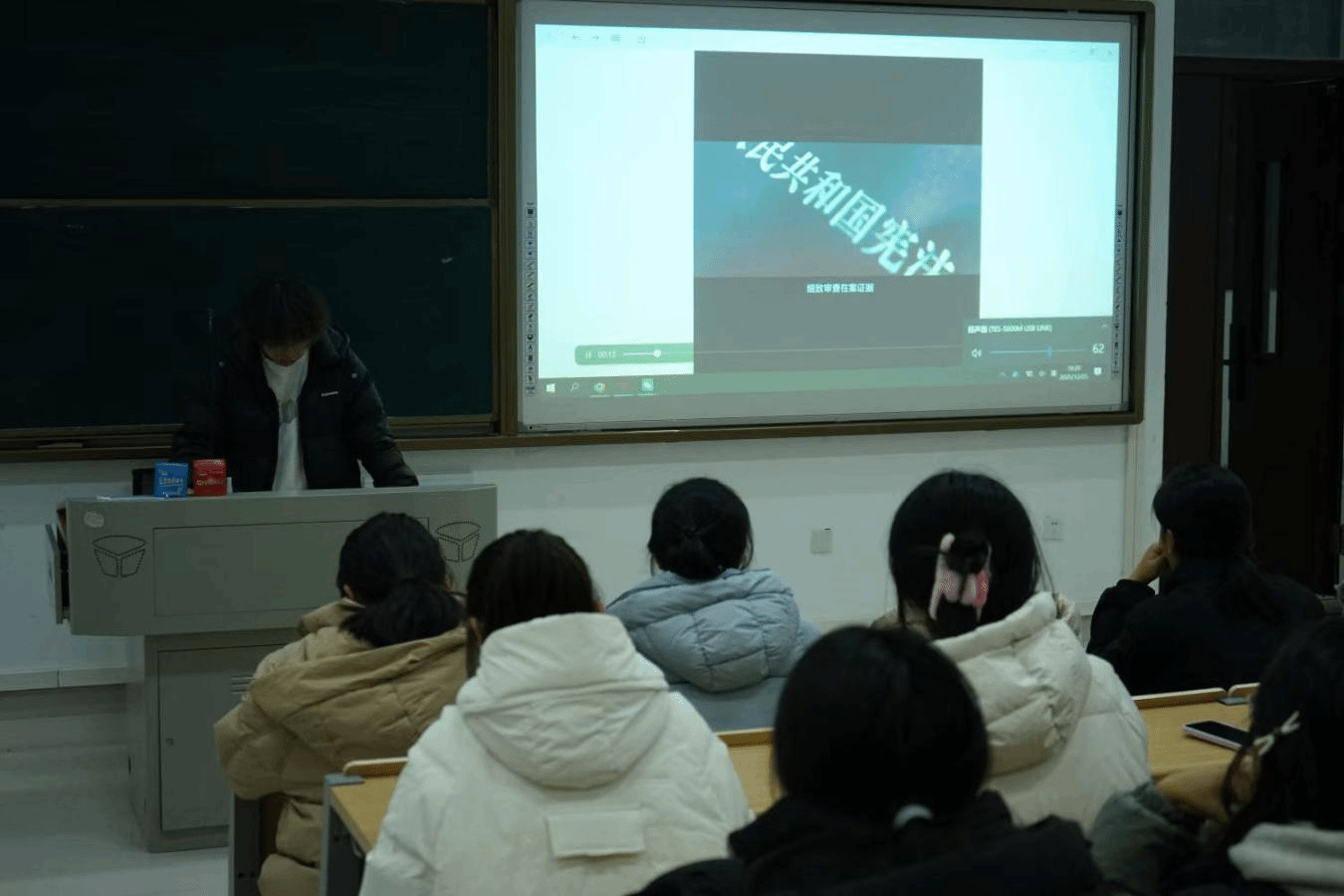 在国家宪法日的大背景下,团支部将法治教育作为活动重点。活动伊始,化学类二班团支书刘广亮播放国家宪法日宣传视频,以情景式学习开启团员青年的法治认知之旅,让法治观念如春风化雨般滋润心田。随后,他顺势引导团员青年思考“法在哪里”,并详细介绍生活中的法律以及宪法所扮演的角色、规定的权利和义务,为同学们搭建起法治知识的基本框架。