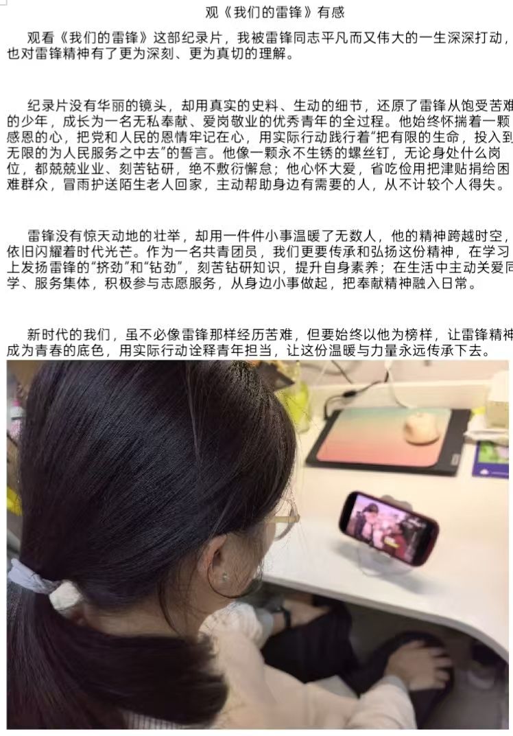 自习室、规范停车秩序,用汗水擦亮校园底色;其余团员通过观看雷锋纪录片、撰写心得感悟 ,在光影中汲取榜样力量。