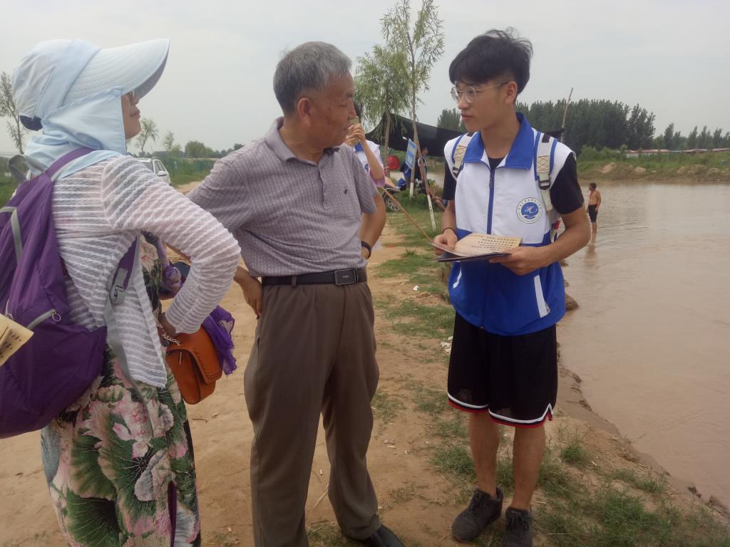 之后观察团进入景区,开始了保护水资源的宣传。游客们认真听取团队的理念,并且与队员交流了自己的想法,给予队员鼓励支持。景区的工作人员讲述了他多年来在黄河边工作的感想。观察团有幸遇到河南大学中原发展研究院张教授,他讲道:“黄河水的治理一直是困扰我们的一大问题,污染物也是顺着黄河水流下来的,我们需要从源头、也就是发源地青藏高原一路沿线去发现问题,另一方面要在河岸两边多增加植被覆盖,以减少水中沙土含量。”大家深受启发,很感谢教授给予的建议。