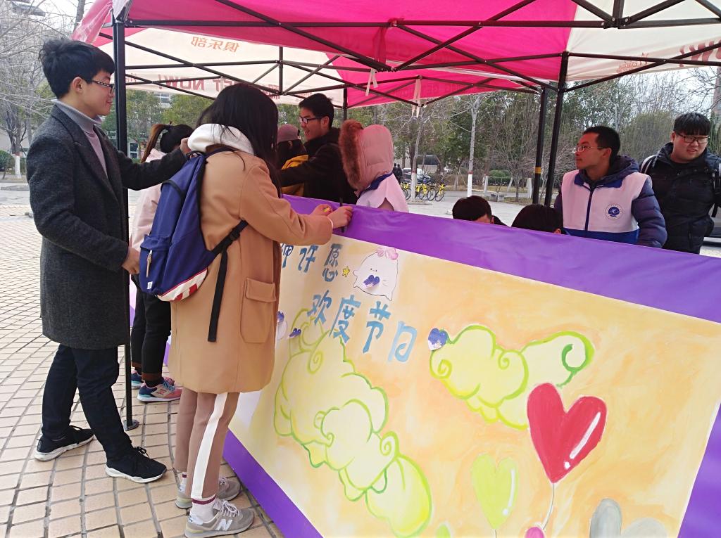 男生积极参与,驻足在心愿墙前,撕下便利贴,帮助女生完成愿望,忙碌的摊位成为了春日里不可多得的一道明媚的风景线。