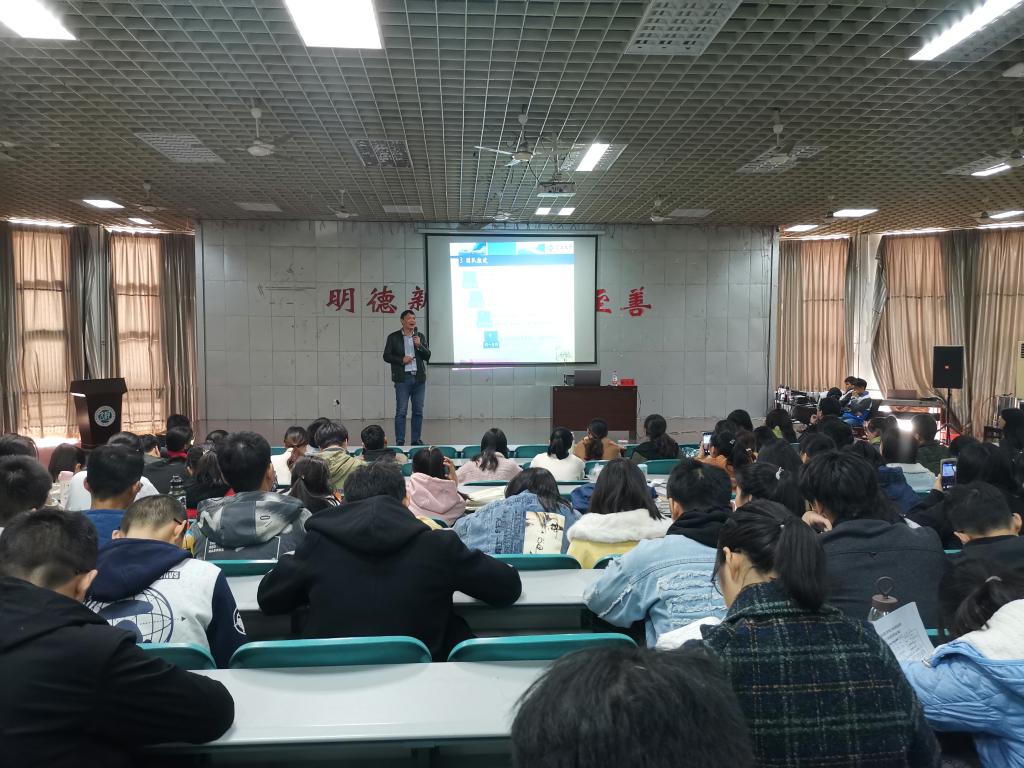 在圆形报告厅举办“创青春”创业大赛宣讲会,副院长徐元清应邀担任主讲人,共有200多名学生到场参加。