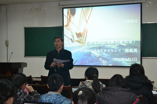 本次讲座的主题为大学生如何理解创新创业。首先,针对主题郭新勇提出“方向比努力更重要”的理念,指出创业是对自己素质、能力、经验的检验,同学们应明确创业具有两面性,是一个艰苦、持久的过程。随后,他对考研问题做出讲解,指出考研应是源于对该学科的浓厚兴趣及热爱,每位同学要根据自己的情况选择考研或工作,不要随波逐流。另外,他指出创业是对自己的实践与肯定,他以自己的亲身经历给出做好老板的三点宝贵意见,即有事业方向、个人魅力和正确处理待遇问题。此外,他认为在大学期间学生应培养创业能力,孵化创业梦想。最后,他指出创业的意义,于国家,是经济活力之源泉;于个人,是建功立业之开始。演讲完毕,学生创业团队代表们踊跃上台进行创业简述并提出问题。郭新勇对同学们所提问题进行详细解答,并对同学们的自我介绍、创业项目介绍等问题给出宝贵建议。