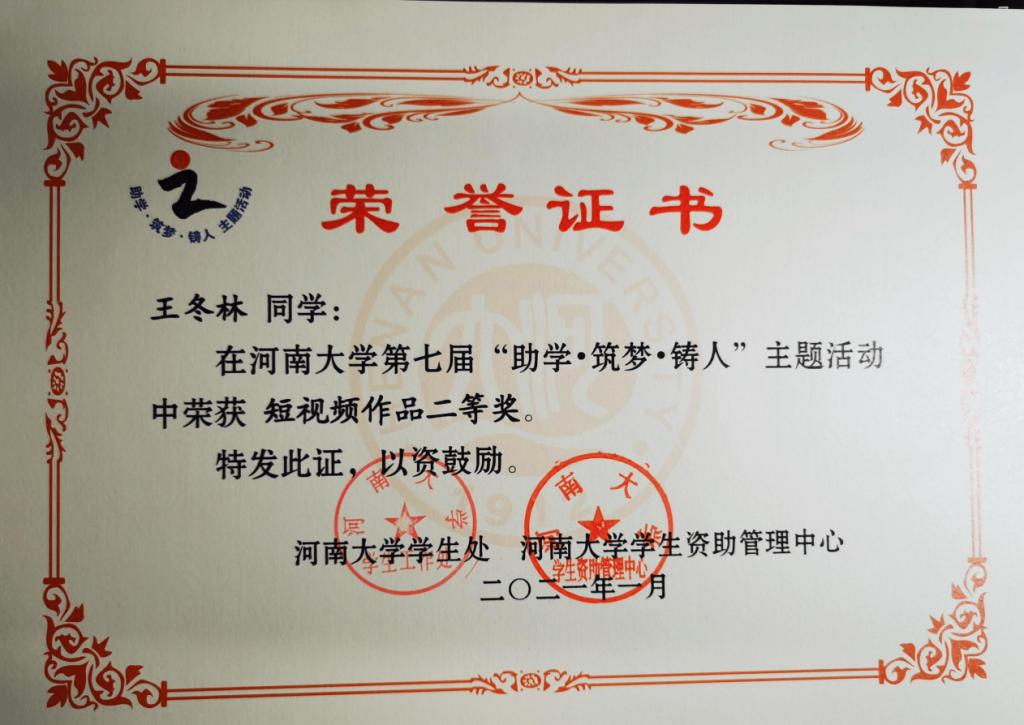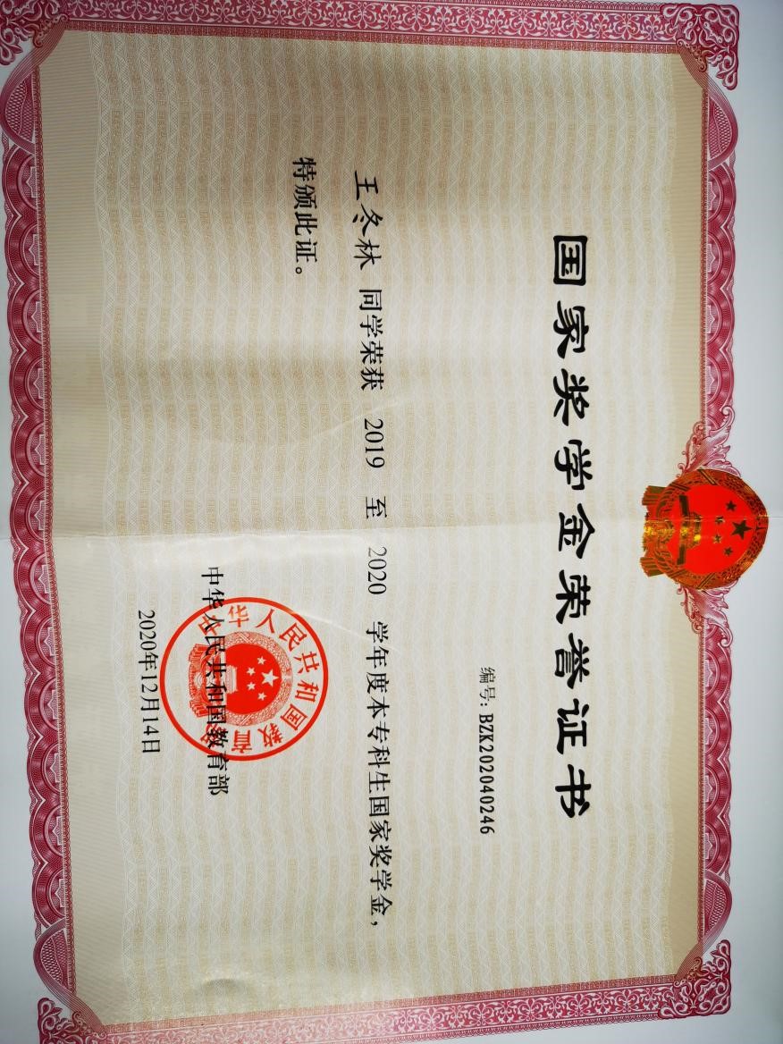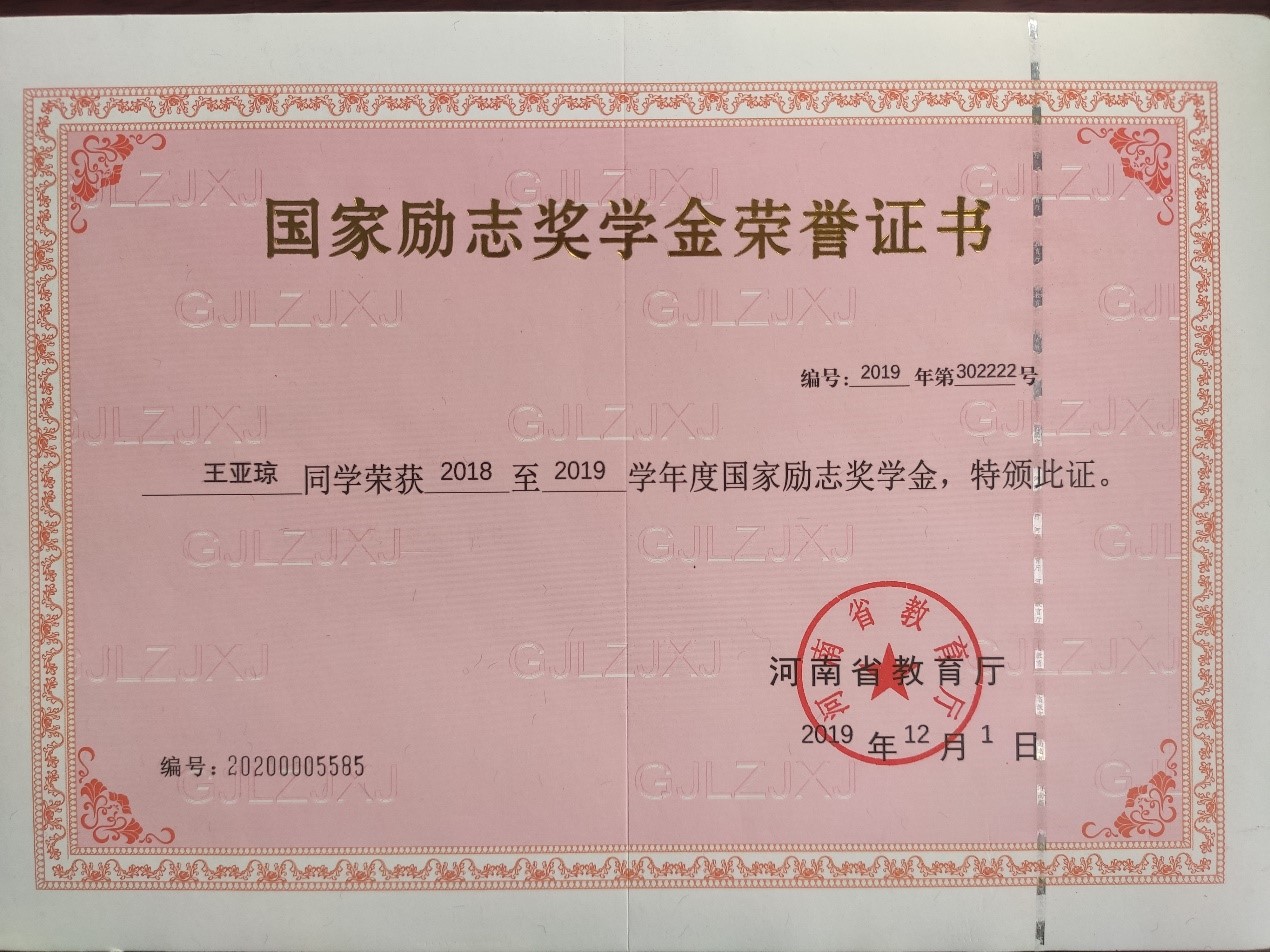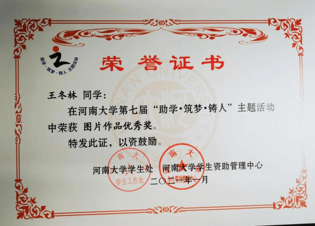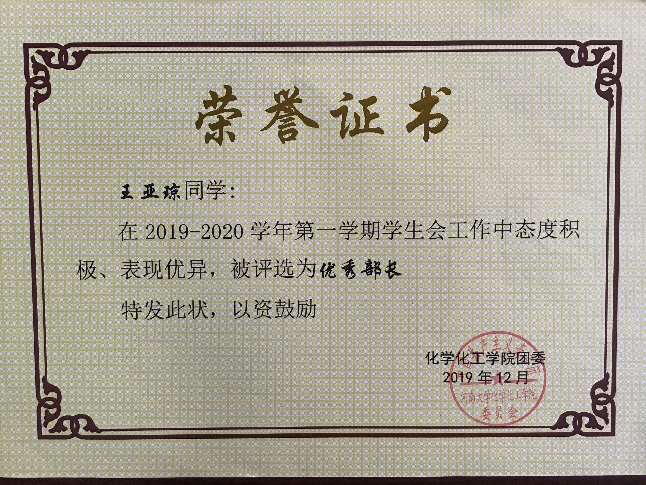 他曾获得国家奖学金、国家励志奖学金、获得河南大学三好学生、河南大学优秀共青团员等荣誉称号,曾获河南大学第七届“助学•筑梦•铸人”主题宣传活动视频作品二等奖、河南大学第七届“助学•筑梦•铸人”主题宣传活动图片作品优秀奖,积极参加全国大学生化工设计大赛和化工原理实验大赛,在前五个学期的成绩排名中位列专业第一,综合排名名列前茅。