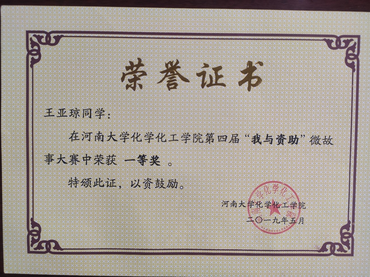第四届“我与资助”微故事大赛一等奖、以主要负责人身份参加了省级大学生创新创业计划项目,参加了第二届华中赛区全国大学生化学实验创新设计竞赛,专业成绩始终名列前茅。