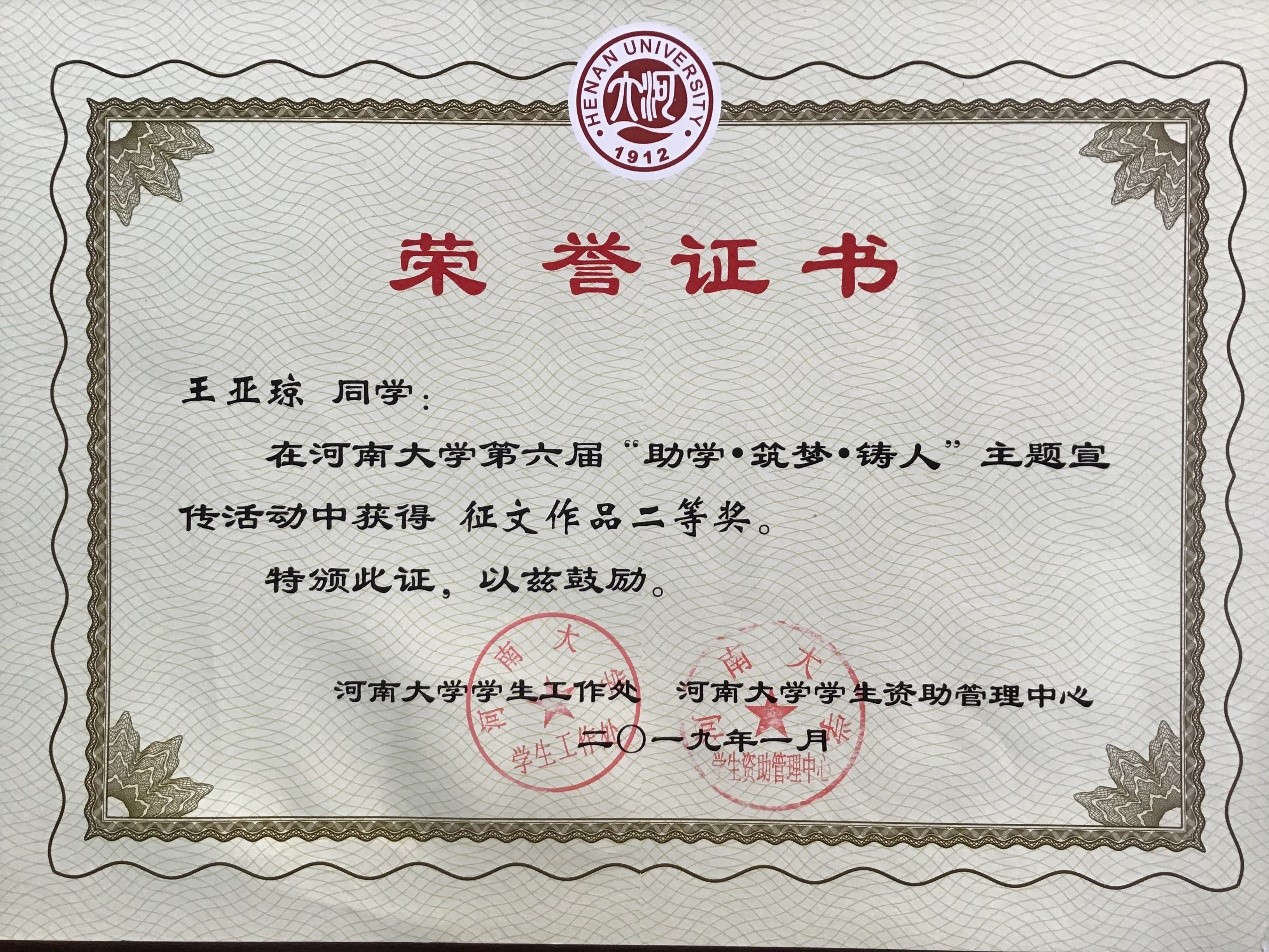 她曾连续两年获得国家励志奖学金、获得河南大学三好学生荣誉称号,曾获河南大学第六届“助学•筑梦•铸人”主题宣传活动征文作品二等奖、化学化工体球网即时比分足球比分