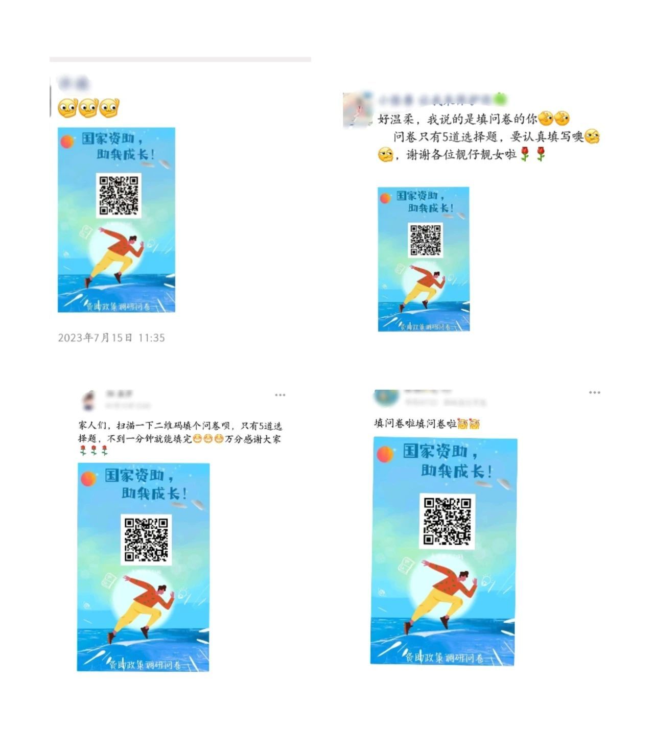 为认真落实国家资助政策,加大宣传学生资助政策,让资助政策深入人心。“传资助之声,燃助学之梦”团队决定先清楚学生和家长对国家资助政策的了解程度,再根据调研结果“对症下药”。7月13日到7月14日,队员们分工合作,通过多渠道查找资料,同时咨询其他同学的建议,精心制作本次问卷。