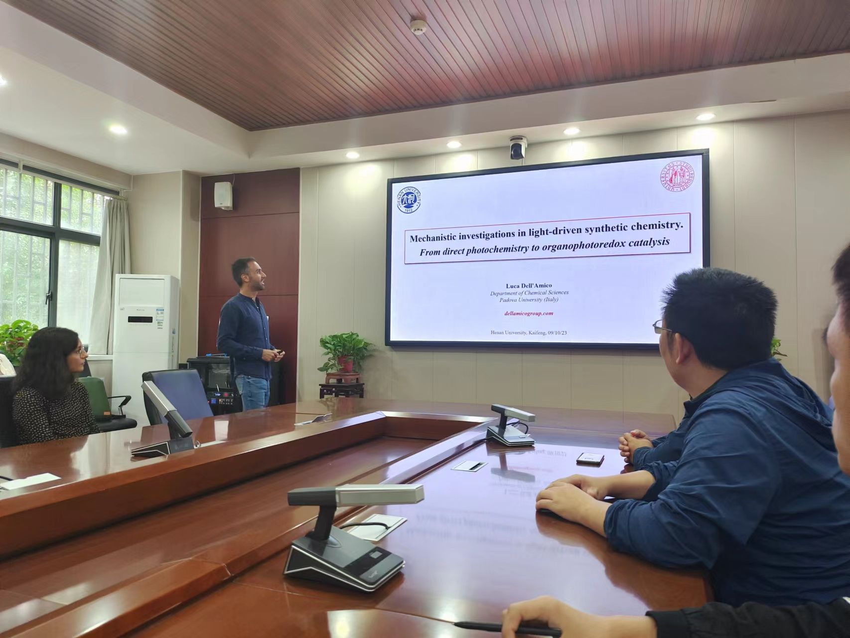 报告中,Luca Dell’Amico详细介绍了其课题组近年来在光促进的新反应以及有机光敏剂开发及应用领域的研究进展。他围绕有机光敏剂的开发及设计等方向详述了一系列芳胺衍生的有机小分子光敏剂光物理化学性质的表征,及其在光促进[2+2]反应中的应用,并讲解了光物理检测手段在光反应机理研究中的应用特点,详细说明了影响光[2+2]反应构建氧杂四元环的关键因素,重点阐述了调控化学选择性的方有效法。报告结束后,他与参会师生进行了深入交流,并全面回答了大家提出的问题。