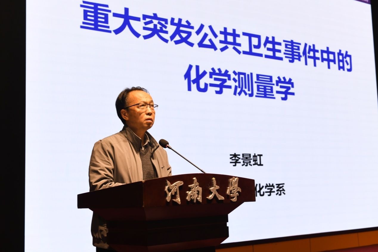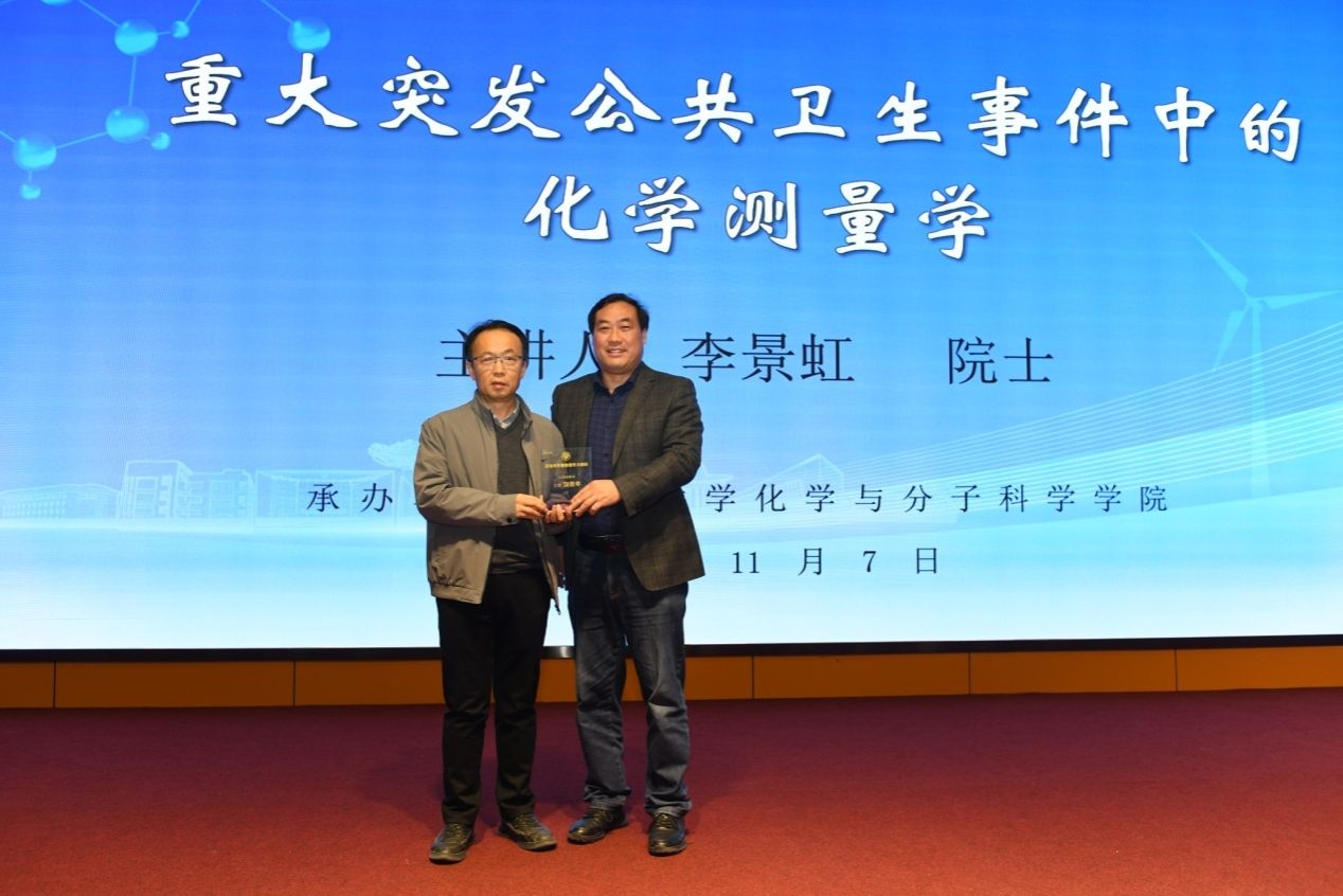 李景虹院士以《重大突发公共安全事件中的化学测量学》为题,深入浅出地讲述了化学测量学及其在重大突发公共卫生事件的过程中发挥的作用。他介绍了课题组近年来在“非典”疫情、新冠肺炎疫情、猴痘疫情等烈性传染病的疫情防控过程中所做的工作,包括发展了“非典”病毒抗原双标记免疫层析检测技术,开发了新冠病毒单碱基分辨核酸快速检测技术与仪器,发现了猴痘病毒基因的核酸二级结构进化特征等,这些为重大突发公共卫生事件的疫情防控做出了积极贡献。在报告会的提问环节,李景虹院士与师生积极互动交流,气氛活跃。国家杰出青年基金获得者、河南大学领军人才至善特聘教授陈雪波为李景虹院士颁发特邀报告人纪念牌,报告会在热烈的掌声中落下帷幕。