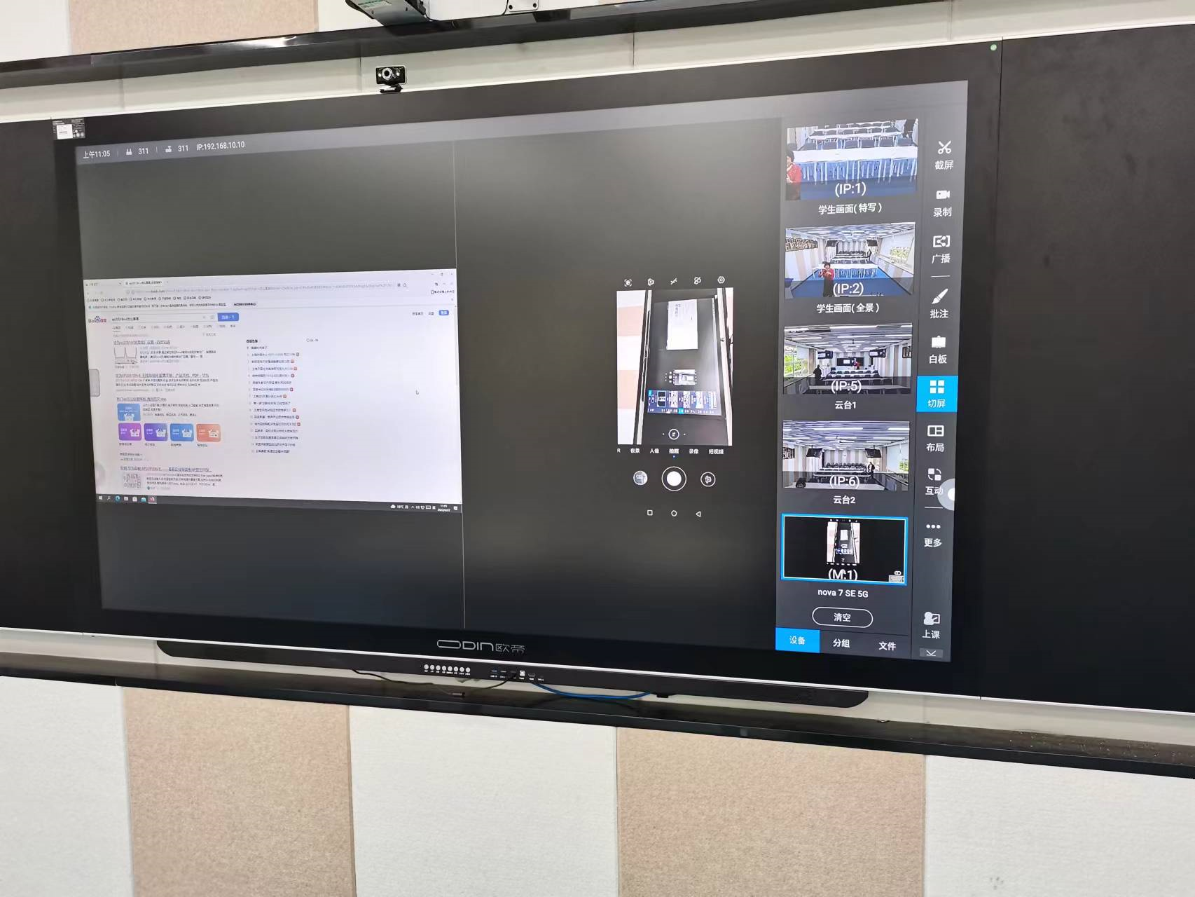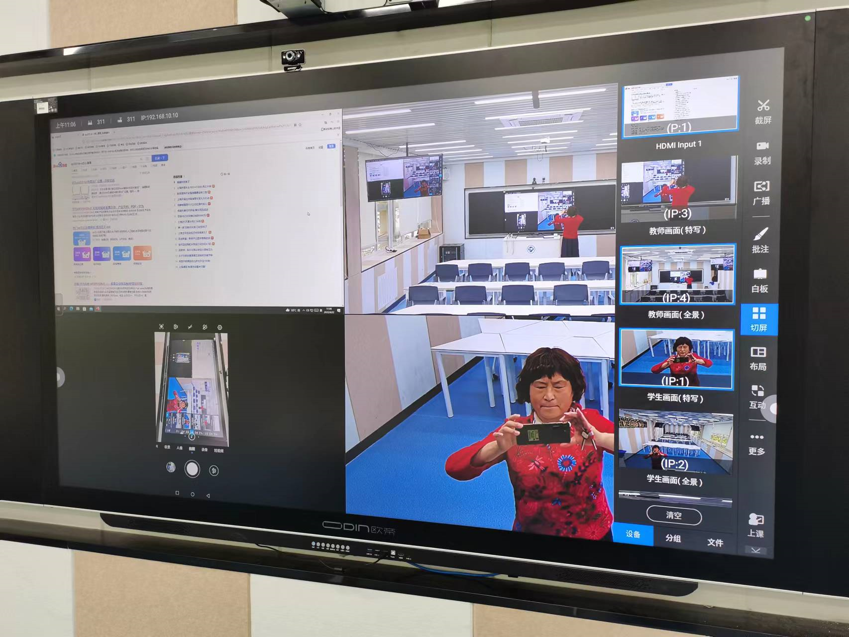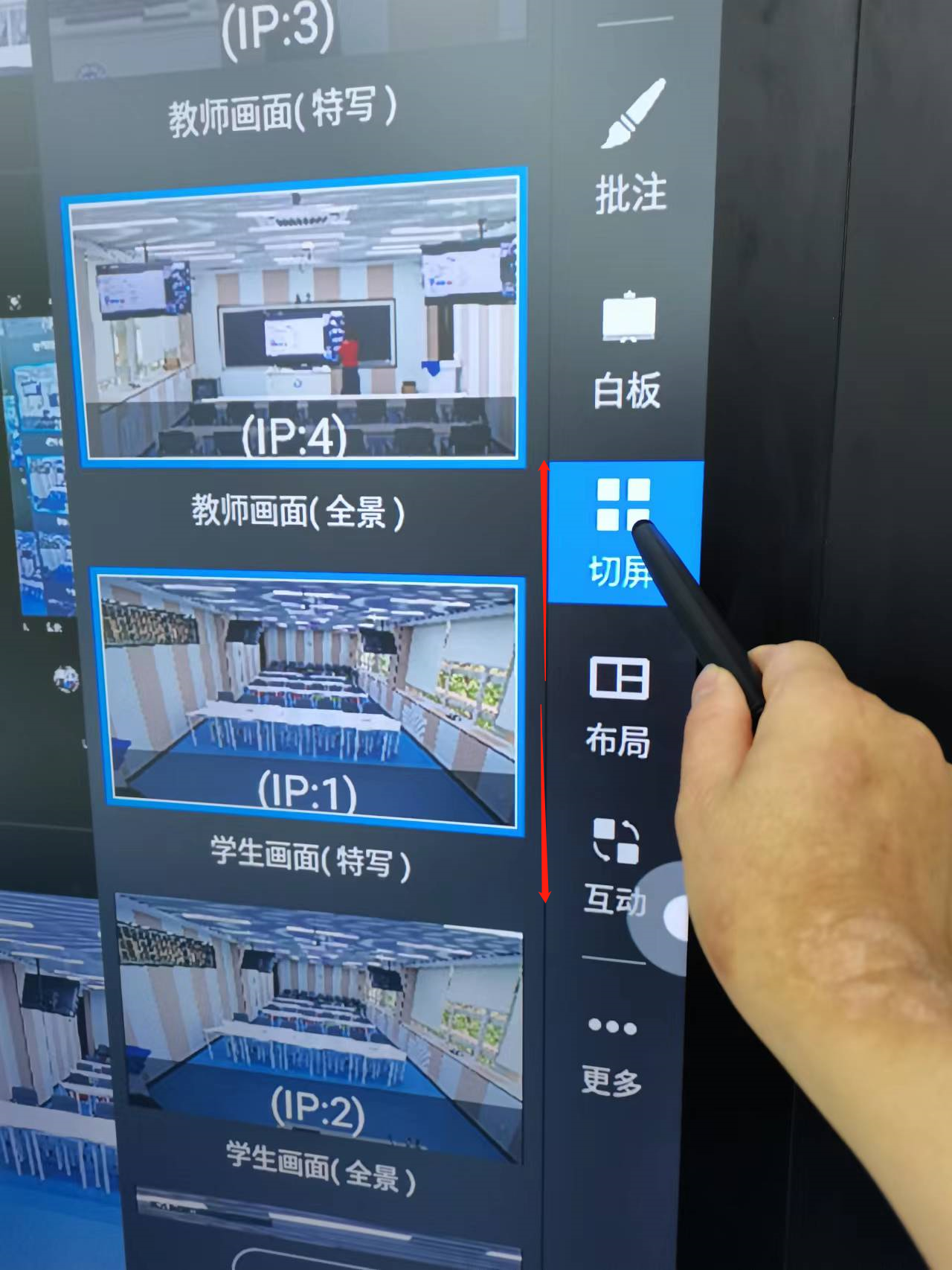 点击“切屏”显示所有摄像头和链接视屏,上下拉动选择需要显示视屏