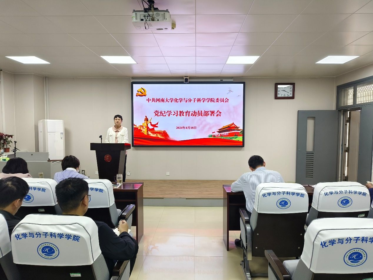 常凤香强调,在全党开展党纪学习教育,是以习近平同志为核心的党中央作出的重大决策,是今年党建工作的一项重要政治任务,是加强党的纪律建设、推动全面从严治党向纵深发展的重要举措。她提出三点要求,一是全院师生党员要进一步提高站位,深刻领会开展党纪学习教育的重要意义,切实增强开展党纪学习教育的紧迫感、责任感和使命感,进一步深化对加强党的纪律建设重要性和忽视党纪、违反党纪问题危害性的认识,准确把握党纪学习教育的目标要求;二是在学习上要下大功夫,聚焦学习新修订的《中国共产党纪律处分条例》,推动党员干部准确掌握其主旨要义和规定要求对标对表学,查找不足,认真整改;三是在结合上要务求实效,坚持两手抓两促进,把开展党纪学习教育同紧抓“双一流”“双航母”战略机遇结合起来,与落实学校年度工作会议部署、完成一流学科创建工作紧密结合起来,使党纪学习教育的每项措施都成为促进中心工作的有效举措,通过学习教育推动党员干部增强党性、严明纪律、改进作风,把党纪学习教育成果转化为凝心聚力实现化学一流学科创建、建设世界一流大学的河大实践,切实把党纪学习教育成果转化为事业发展的实际成效。